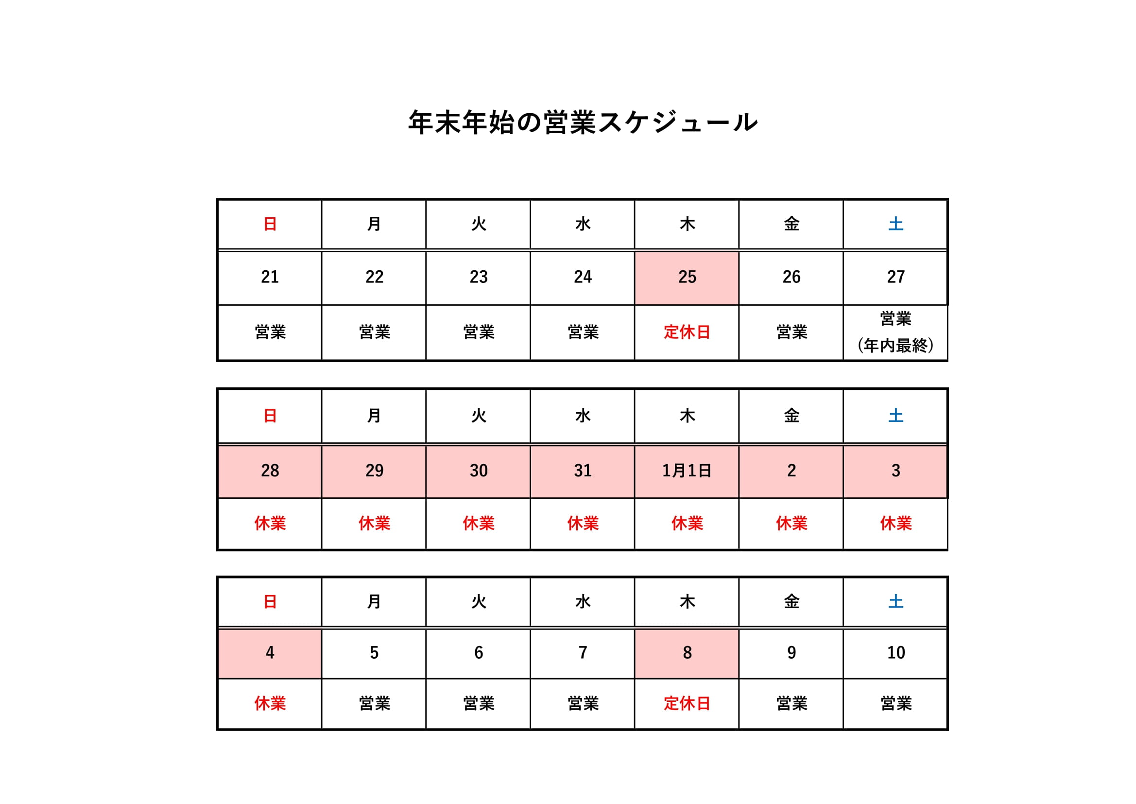 上記、年末年始スケジュールとなります。※支店は、毎週水木曜日定休のため、26年1月7日(水)は定休日となります。ご注意ください。